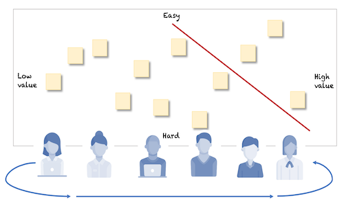 Have one person in the group draw a diagonal line. This line is the priority line, with everything above the line becoming a priority and everything below getting cut. As a team, debate the placement of the line until you can reach agreement on the priorities.
